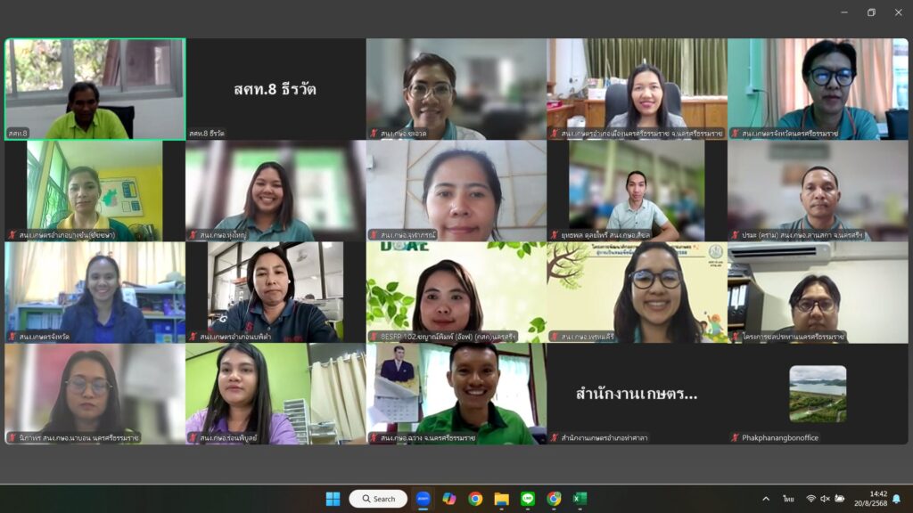 วันที่ 4 และ 18 – 22 สิงหาคม 2568 สำนักงานเศรษฐกิจการเกษตรที่ 8 จัดประชุมหารือพิจารณาข้อมูล ปาล์มน้ำมัน ยางพารา มะพร้าว สับปะรดพันธุ์ปัตตาเวีย ปี 2567 ข้าวนาปี ปีเพาะปลูก 2567/68 กาแฟ ปี 2568 จังหวัดกระบี่ ชุมพร นครศรีธรรมราช และสุราษฎร์ธานี ผ่านระบบการประชุมทางไกลด้วยโปรแกรม Zoom Cloud Meetings เพื่อนำผลการพิจารณาข้อมูลเสนอต่อคณะทำงานพัฒนาคุณภาพข้อมูลภาคใต้ ต่อไป