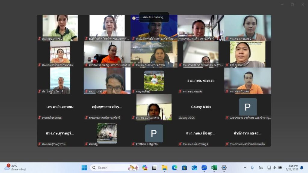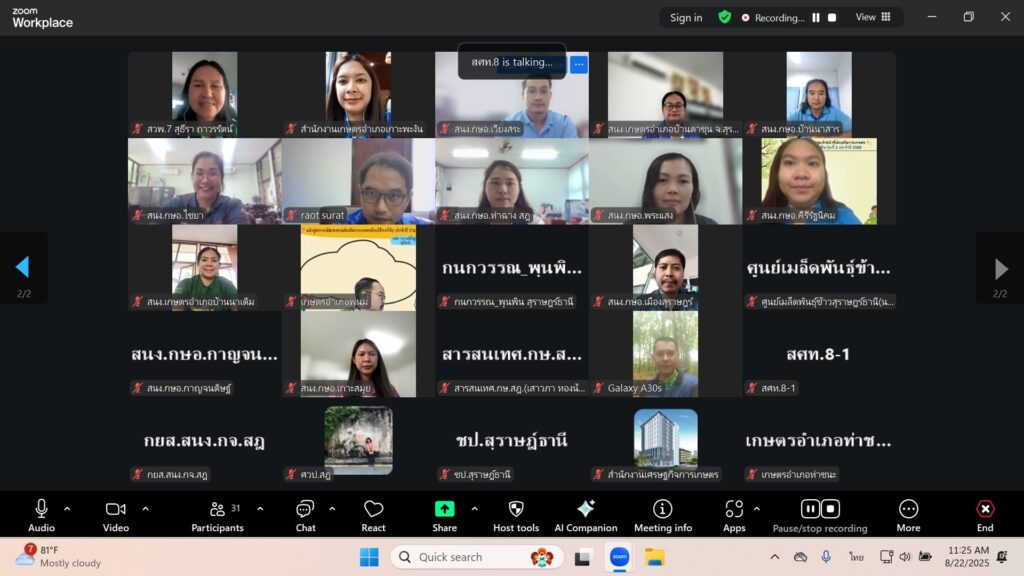 วันที่ 4 และ 18 – 22 สิงหาคม 2568 สำนักงานเศรษฐกิจการเกษตรที่ 8 จัดประชุมหารือพิจารณาข้อมูล ปาล์มน้ำมัน ยางพารา มะพร้าว สับปะรดพันธุ์ปัตตาเวีย ปี 2567 ข้าวนาปี ปีเพาะปลูก 2567/68 กาแฟ ปี 2568 จังหวัดกระบี่ ชุมพร นครศรีธรรมราช และสุราษฎร์ธานี ผ่านระบบการประชุมทางไกลด้วยโปรแกรม Zoom Cloud Meetings เพื่อนำผลการพิจารณาข้อมูลเสนอต่อคณะทำงานพัฒนาคุณภาพข้อมูลภาคใต้ ต่อไป