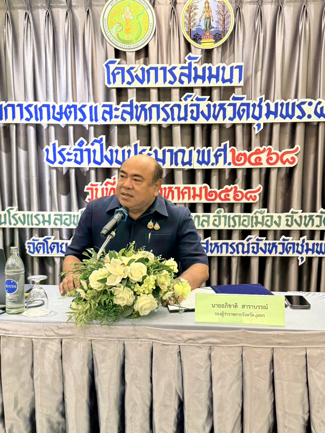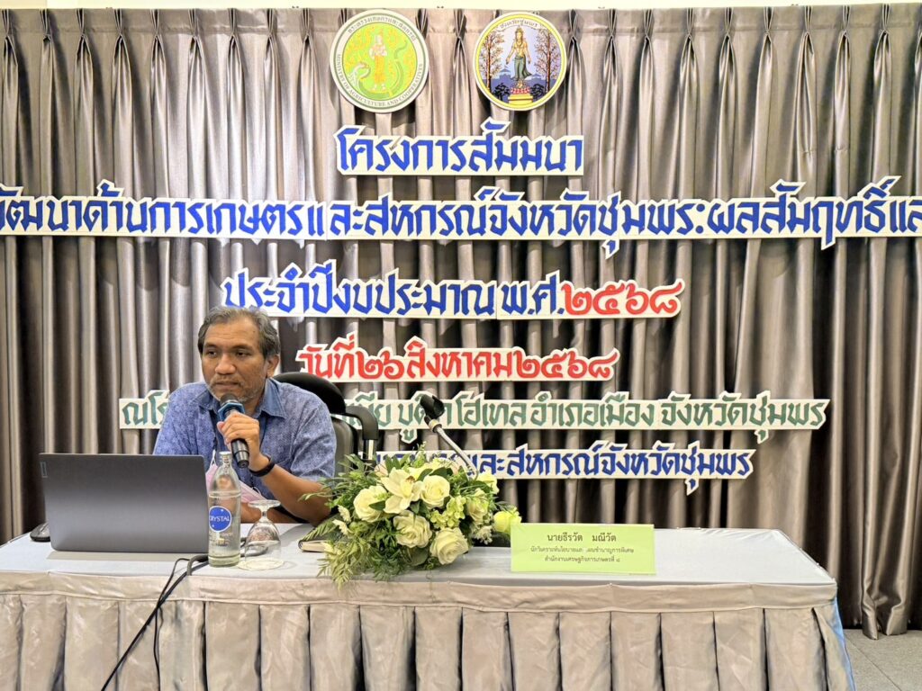 วันที่ 26 สิงหาคม 2568 นายนิกร แสงเกตุ ผู้อำนวยการสำนักงานเศรษฐกิจการเกษตรที่ 8 มอบหมายให้นายธีรวัต มณีวัต ผู้อำนวยการส่วนสารสนเทศการเกษตรเข้าร่วมสัมมนาการขับเคลื่อนการพัฒนาด้านการเกษตรและสหกรณ์จังหวัดชุมพร : ผลสัมฤทธิ์และทิศทางอนาคต ประจำปีงบประมาณ พ.ศ. 2568 ซึ่งจัดโดยสำนักงานเกษตรและสหกรณ์จังหวัดชุมพร โดยมีนายอภิชาติ สาราบรรณ์ รองผู้ว่าราชการจังหวัดชุมพร เป็นประธานในพิธีกล่าวเปิดสัมมนา การสัมมนาครั้งนี้มีวัตถุประสงค์เพื่อสรุปผลการขับเคลื่อนการดำเนินงานตามนโยบายสำคัญของกระทรวงเกษตรและสหกรณ์ และเพื่อกำหนดแนวทางการขับเคลื่อนการพัฒนาด้านการเกษตรและสหกรณ์จังหวัดชุมพรในอนาคต ในการนี้นายธีรวัต มณีวัต ได้นำเสนอภาวะเศรษฐกิจการเกษตรจังหวัดชุมพร ไตรมาส 2/2568 และแนวโน้มปี 2568 สถานการณ์สินค้าเกษตรที่สำคัญจังหวัดชุมพร ปี 2568 และการประกันภัยพืชผล ให้ผู้เข้าร่วมสัมมนาได้รับทราบ