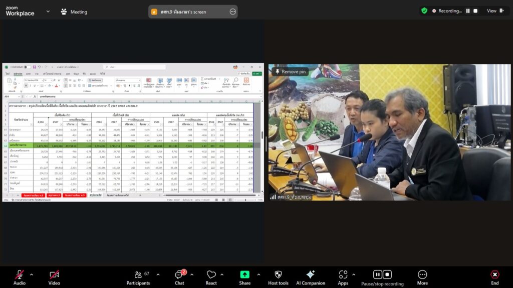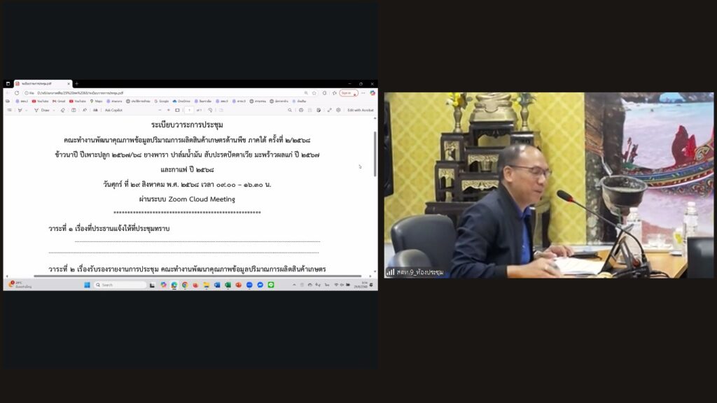 วันศุกร์ ที่ 29 สิงหาคม 2568 นายนิกร แสงเกตุ ผู้อำนวยการสำนักงานเศรษฐกิจการเกษตรที่ 8 (สศท.8 ) และนายไพฑูรย์ สีลาพัฒน์ ผู้อำนวยการสำนักงานเศรษฐกิจการเกษตรที่ 9 (สศท.9) ร่วมเป็นประธานการประชุมคณะทำงานพัฒนาคุณภาพข้อมูลปริมาณการผลิตสินค้าเกษตรด้านพืชภาคใต้ ครั้งที่ 2/2568 ณ ห้องประชุมสำนักงานเศรษฐกิจการเกษตรที่ 9 และผ่านระบบการประชุมทางไกลด้วยปรแกรม ZOOM Cloud Meetings