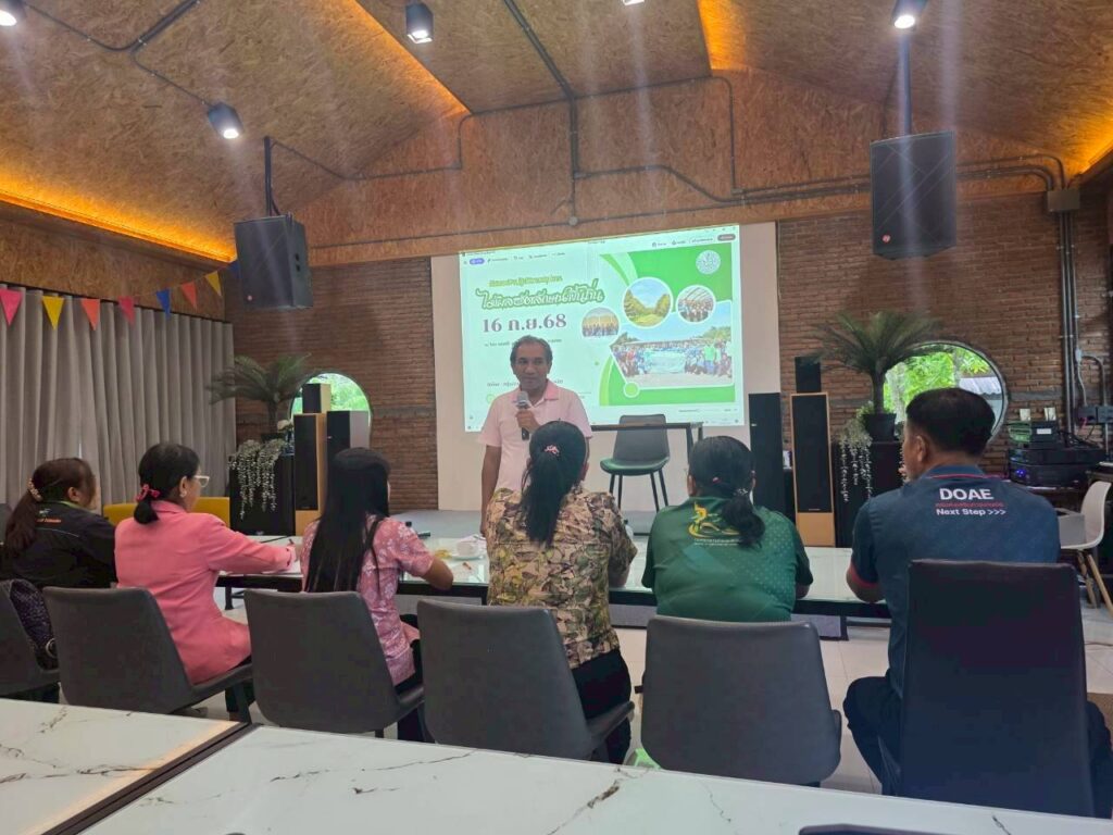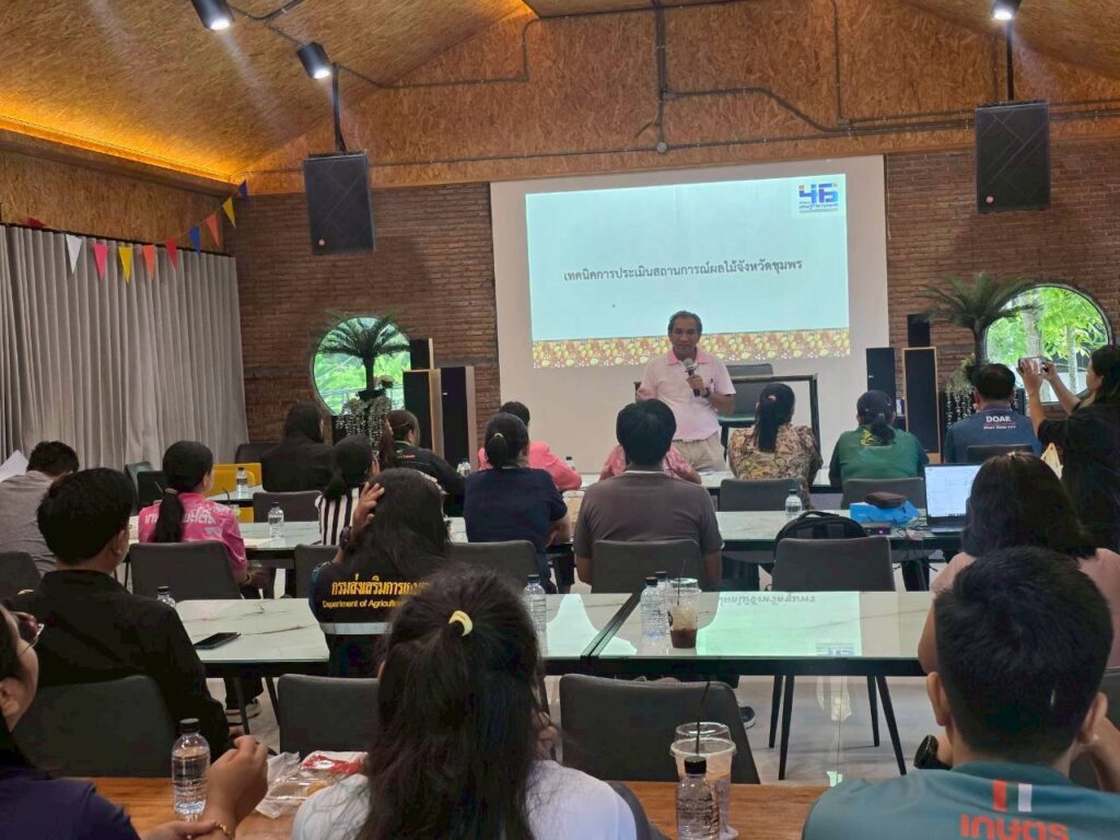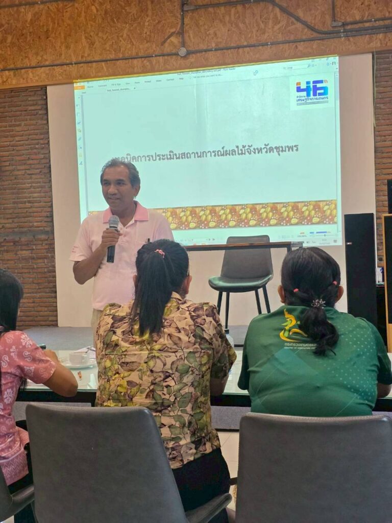 วันที่ 16 กันยายน 2568 นายนิกร แสงเกตุ ผู้อำนวยการสำนักงานเศรษฐกิจการเกษตรที่ 8 มอบหมายให้นายธีรวัต มณีวัต ผู้อำนวยการส่วนสารสนเทศการเกษตร เป็นวิทยากรบรรยายเทคนิคการจัดทำข้อมูลประเมินสถานการณ์ไม้ผลจังหวัดชุมพร ในการสัมมนาและประชุมสรุปผลโครงการส่งเสริมและพัฒนาสินค้าเกษตรอัตลักษณ์พื้นถิ่นเพื่อเข้าสู่ห่วงโซ่อุปทานเศรษฐกิจสร้างสรรค์ ปีงบประมาณ พ.ศ. 2568 ณ โฮม คอฟฟี่ ชุมพร อำเภอเมืองชุมพร จังหวัดชุมพร โดยมีผู้เข้าร่วมกิจกรรมประกอบด้วย เจ้าหน้าที่ระดับจังหวัด และอำเภอ รวมจำนวน 36 คน เพื่อสรุปผลการดำเนินงานที่ได้ร่วมกันขับเคลื่อนงานด้านไม้ผลตลอดระยะเวลา 1 ปี ได้องค์ความรู้เติมเต็มเพื่อนำมาเป็นแนวทางในการพัฒนาพื้นที่ของตนเอง ได้ร่วมแลกเปลี่ยนและให้ข้อคิดเห็นในการดำเนินงานโครงการฯ ให้สามารถดำเนินการขับเคลื่อนเพื่อพัฒนาศักยภาพการผลิตไม้ผลตลอดห่วงโซ่อุปทาน และพัฒนางานบริหารจัดการผลไม้ได้อย่างเป็นระบบต่อไป