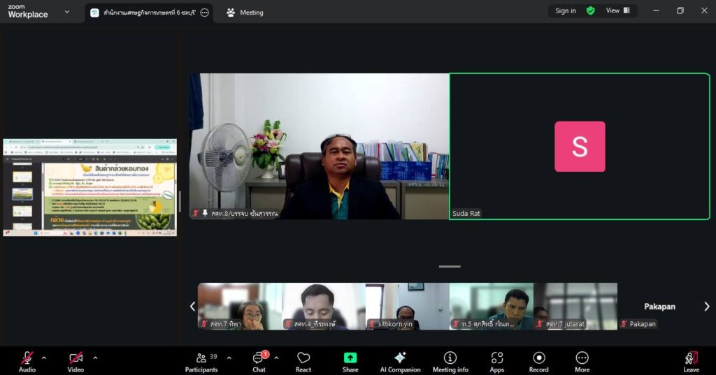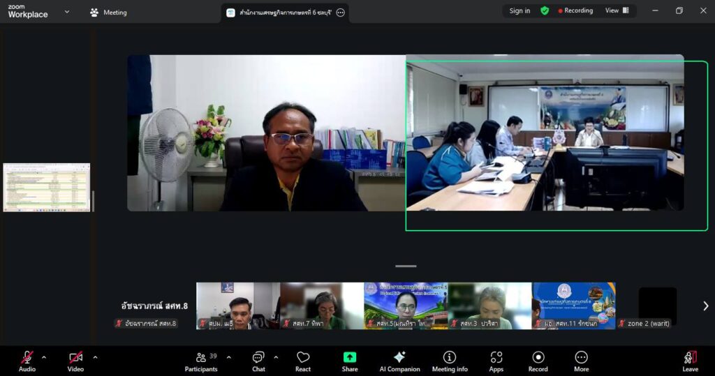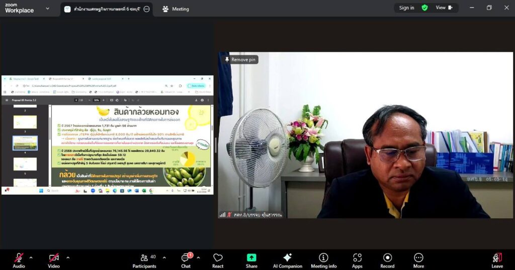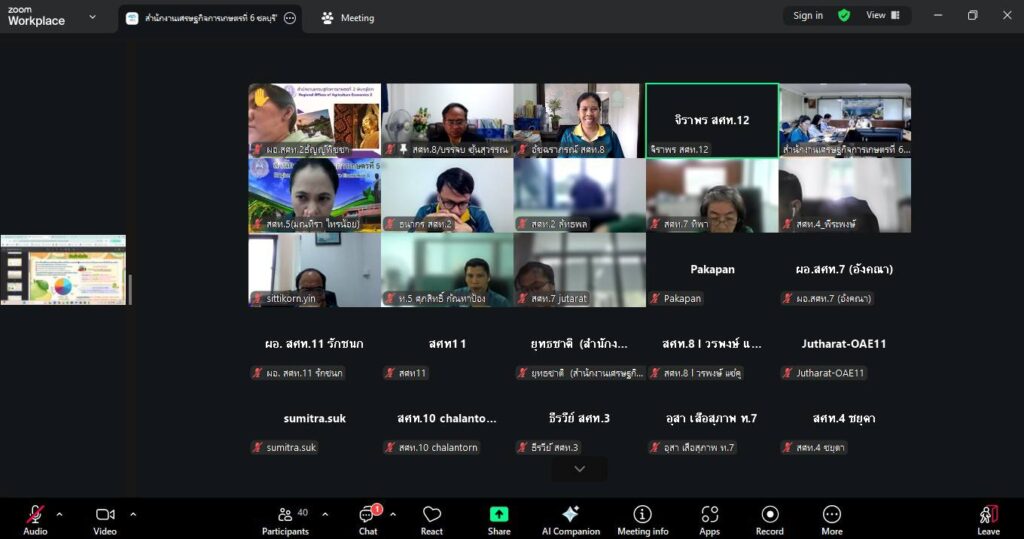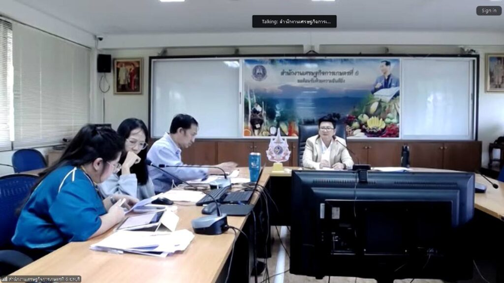 วันพุธที่ 8 ตุลาคม 2568 นายนิกร แสงเกตุ ผู้อำนวยการสำนักงานเศรษฐกิจการเกษตรที่ 8 มอบหมายให้ส่วนวิจัยและประเมินผล นำโดย นายบรรจบ ซุ้นสุวรรณ ผู้อำนวยการส่วนวิจัยและประเมินผล พร้อมด้วยนักวิจัย สศท.8 เข้าร่วมประชุมหารือการจัดทำเค้าโครงเอกสารงานวิจัยและประเมินผล (Proposal) ปี 2569 โดยมี นางสาวนริศรา เอี่ยมคุ้ย ผู้อำนวยการสำนักงานเศรษฐกิจการเกษตรที่ 6 เป็นประธานการประชุมฯ และคณะอนุกรรมการพัฒนางานด้านวิจัยและติดตามประเมินผล สศท.1-12 เข้าร่วมประชุมผ่านระบบออนไลน์ Zoom Meeting อย่างพร้อมเพรียง
