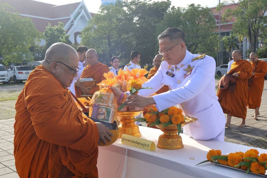 วันที่ 13 ต.ค.68 เวลา 07.30 น. นายนิกร แสงเกตุ ผู้อำนวยการสำนักงานเศรษฐกิจการเกษตรที่ 8 มอบหมายให้นางสาวจันทร คำดา นักจัดการงานทั่วไปชำนาญการ หัวหน้าฝ่ายบริหารทั่วไปและเจ้าหน้าที่ เข้าร่วมพิธีทำบุญตักบาตรถวายเป็นพระราชกุศลเนื่องในวันนวมินทรมหาราช 13 ตุลาคม 2568 โดยมีนายธีรุตม์ ศุภวิบูลย์ผล ผู้ว่าราชการจังหวัดสุราษฎร์ธานี เป็นประธานในพิธีทำบุญตักบาตรถวายเป็นพระราชกุศลเนื่องในวันนวมินทรมหาราช 13 ตุลาคม 2568 และพระพรหมวชิรเมธาจารย์ เจ้าคณะภาค 16 เจ้าอาวาสวัดไตรธรรมาราม เป็นประธานฝ่ายสงฆ์ ตลอดจนพระสงฆ์ทรงสมณศักดิ์ รวม 10 รูป รองผู้ว่าราชการจังหวัดสุราษฎร์ธานี หัวหน้าส่วนราชการ ทหาร ตำรวจ องค์กรปกครองส่วนท้องถิ่นและพสกนิกรทุกหมู่เหล่า เข้าร่วมพิธีสวดพระพุทธมนต์ จากนั้นผู้ว่าราชการจังหวัดสุราษฎร์ธานี ได้นำผู้เข้าร่วมพิธีร่วมทำบุญตักบาตรแด่พระภิกษุสงฆ์ จำนวน 92 รูป ต่อมาเวลา 08.30 น.เข้าร่วมพิธีวางพวงมาลา ณ อาคารศูนย์กลางการประชุมสัมมนาภาคใต้ตอนบนศาลากลางจังหวัดสุราษฎร์ธานี