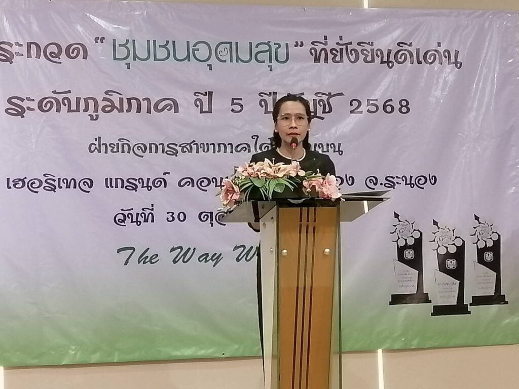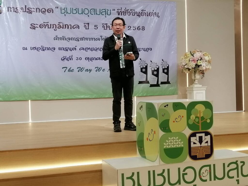 วันที่ 30 ตุลาคม 2568 นายนิกร แสงเกตุ ผู้อำนวยการสำนักงานเศรษฐกิจการเกษตรที่ 8 มอบหมายให้ นางอัชฉราภรณ์ สงประสพ นักวิเคราะห์นโยบายและแผนชำนาญการพิเศษ สำนักงานเศรษฐกิจการเกษตรที่ 8 (สศท.8) ร่วมเป็นคณะกรรมการประกวดชุมชนอุดมสุขยั่งยืน ระดับภาค ประจำปี 2568 ณ เฮอริเทจ แกรนด์ คอนเวนชั่น อำเภอเมือง จังหวัดระนอง โดยมี นางสาวกีรติญา ทิมเมือง คลังจังหวัดระนอง เป็นประธานกล่าวในพิธีเปิด และ นายอภิชาติ กรมาทิตย์สุข รองผู้อำนวยการฝ่ายกิจการสาขาภาคใต้ตอนบน ธนาคารเพื่อการเกษตรและสหกรณ์การเกษตร (ธ.ก.ส.) ร่วมด้วยในพิธีเปิดและมอบรางวัล