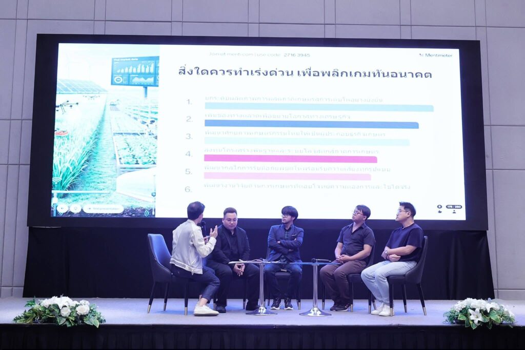 ทั้งนี้ ภายในงานช่วงบ่ายมีการจัดเวทีเสวนาหัวข้อ จับเข่าคุย “พลิกเกมเกษตรทันอนาคต” เพื่อแลกเปลี่ยนมุมมองและประสบการณ์จากเกษตรกรรุ่นใหม่และผู้เชี่ยวชาญด้านนวัตกรรมและโมเดลธุรกิจที่ประสบความสำเร็จในการปรับตัว โดยมีผู้ร่วมเสวนาประกอบด้วย 1) นายณัฐวุฒิ จันทร์เรือง เจ้าของสวนจันทร์เรือง 2) นายผดุงพล สุคนธมนตรีกุล เจ้าของกิจการแม่ปลูกลูกขาย 3) ดร.ปรเมษฐ์ ชุ่มยิ้ม ที่ปรึกษาอาวุโสและผู้จัดการ Platform FI Accelerator และ 4) นายนิทัศน์ ศรีอุราม ผู้แทนจากโครงการฝึกงานผู้นำเยาวชนเกษตรกรไทยในประเทศญี่ปุ่น (JAEC) ดำเนินรายการโดย นายธีรวัฒน์ พึ่งทอง ผู้ประกาศข่าว MCOT ซึ่งได้รับความสนใจจากผู้เข้าร่วมงานเป็นจำนวนมาก