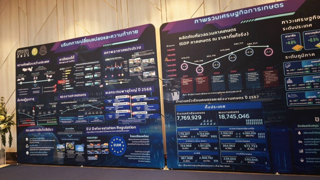ในการนี้ นายพีรพันธ์ คอทอง ได้นำเสนอภาพรวมเศรษฐกิจและความเสี่ยงที่ส่งผลกระทบต่อภาคเกษตรไทย โดยระบุว่ากองทุนการเงินระหว่างประเทศ (IMF) คาดการณ์เศรษฐกิจโลกปี 2568 ขยายตัวร้อยละ 3.2 โดยการเติบโตยังคงมีความเปราะบางจากความไม่แน่นอนทางนโยบายการค้าและภูมิรัฐศาสตร์ ขณะที่สำนักงานสภาพัฒนาการเศรษฐกิจและสังคมแห่งชาติ (สศช.) คาดว่าเศรษฐกิจไทยปี 2568 จะขยายตัวร้อยละ 2.0 จากแรงหนุนของการบริโภคและการลงทุนภาคเอกชน ในส่วนของภาคเกษตรไทยยังต้องเผชิญกับ “5 ปัจจัยเสี่ยงสำคัญ” ได้แก่ 1) ความขัดแย้งระหว่างประเทศที่อาจส่งผลต่อราคาพลังงานและต้นทุนการผลิต 2) มาตรการกีดกันทางการค้าและมาตรฐานสินค้ารูปแบบใหม่ 3) สภาพอากาศแปรปรวนและภัยพิบัติทางธรรมชาติ 4) กระแสการเติบโตสีเขียว (Green Growth) และ 5) โครงสร้างประชากรสูงวัยที่ส่งผลต่อปัญหาการขาดแคลนแรงงาน ซึ่งเป็นโจทย์ใหญ่ที่ภาคเกษตรต้องเร่งปรับตัว