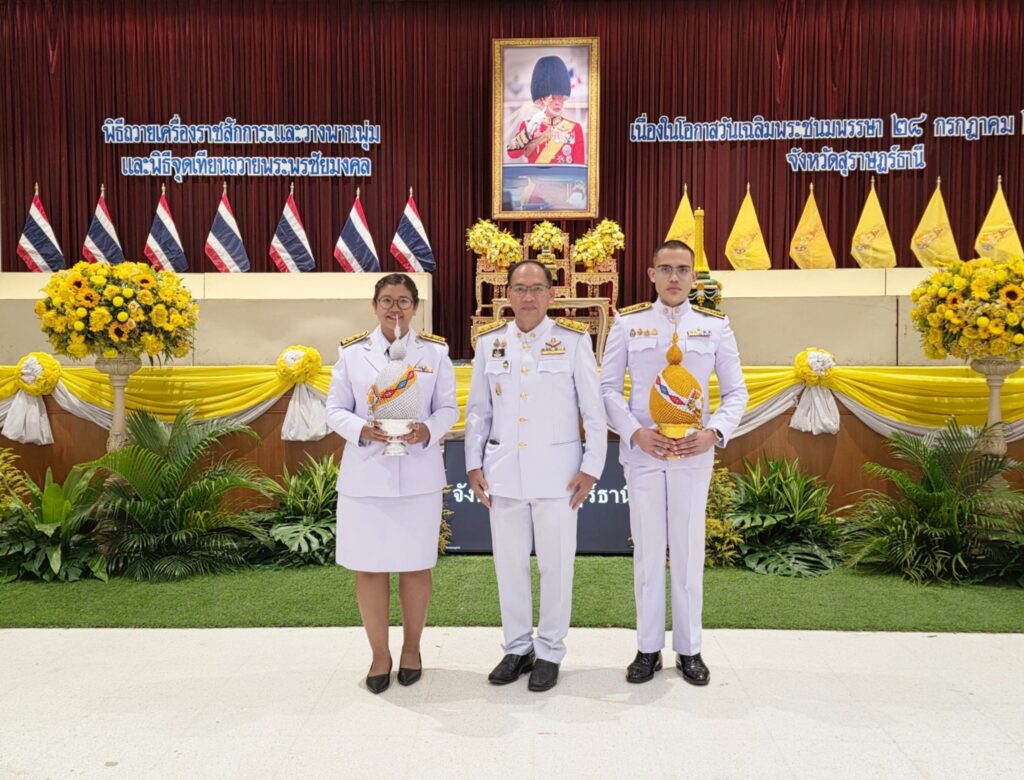 วันที่ 28 กรกฎาคม 2568 นายนิกร แสงเกตุ ผู้อำนวยการสำนักงานเศรษฐกิจการเกษตรที่ 8 พร้อมด้วย นางสาวจิรฐา คำรูญ นักวิเคราะห์นโยบายและแผนชำนาญการ และนายศตพล สุคนธชาติ นักวิเคราะห์นโยบายและแผนปฏิบัติการ ร่วมพิธีถวายเครื่องราชสักการะและวางพานพุ่ม และพิธีจุดเทียนถวายพระพรชัยมงคล เพื่อเฉลิมพระเกียรติแด่พระบาทสมเด็จพระเจ้าอยู่หัว เนื่องในโอกาสวันเฉลิมพระชนมพรรษาพระบาทสมเด็จพระปรเมนทรรามาธิบดีศรีสินทรมหาวชิราลงกรณ มหิศรภูมิพลราชวรางกูร กิติสิริสมบูรณอดุลยเดช สยามินทราธิเบศรราชวโรดม บรมมนาถบพิตร พระวชิรเกล้าเจ้าอยู่หัว ณ อาคารศูนย์กลางการประชุมสัมมนาภาคใต้ตอนบน ศาลากลางจังหวัดสุราษฎร์ธานี เพื่อแสดงออกถึงความจงรักภักดีต่อสถาบันพระมหากษัตริย์